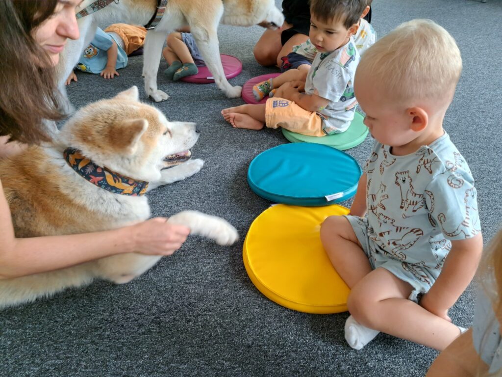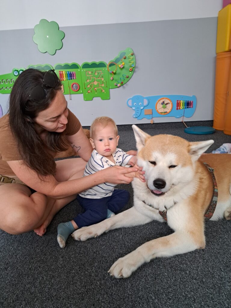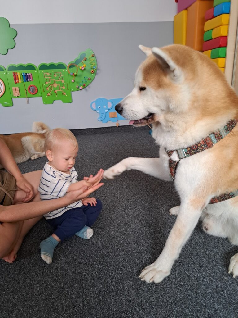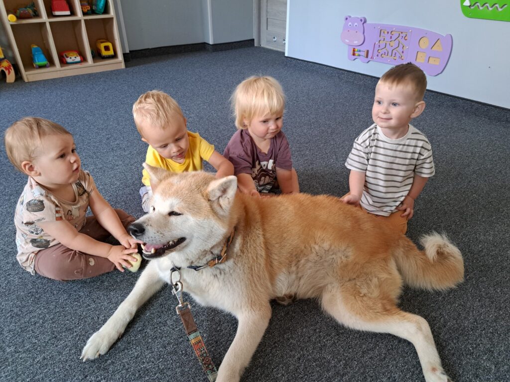 Dzieci w Pozytywnym Żłobku w Gliwicach miały ostatnio przemiłych i niesamowitych gości – dwa pieski z ich Panią. Przy kontakcie ze zwierzętami radości i ekscytacji było co nie miara. Dzieci na początku były trochę nieufne i bardzo ostrożne, ale z każdą chwilą coraz bardziej przekonywały się do spokojnych i grzecznych piesków. To spotkanie, to nie były tylko zwykłe odwiedziny i zabawa -dogoterapia lub inaczej kynoterapia bardzo pozytywnie wpływa na dzieci: ćwiczy się przez to koncentrację uwagi, rozwija mowę i funkcje poznawcze, a także pomaga w doskonaleniu dużej i małej motoryki. Dodatkowo, dzieci dzięki kontaktowi z psami łatwiej nawiązują kontakty z innymi osobami. Mamy więc nadzieję, że Pani Ola odwiedzi nas jeszcze nie raz ze swoimi pupilami.